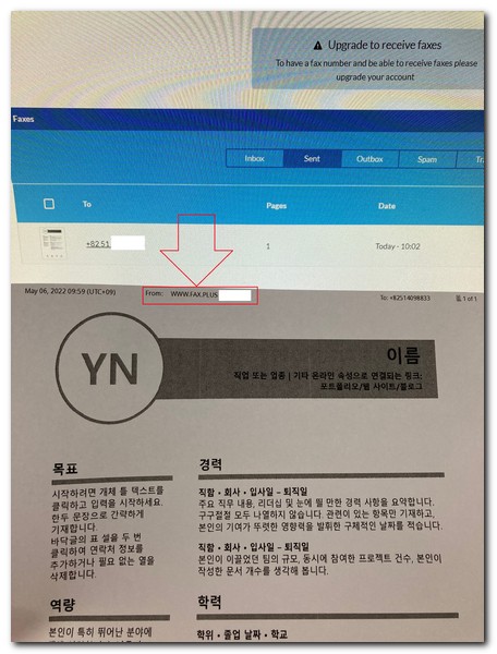 화면과 같이 팩스를 안전하게 전달 받았다면 받은 사람의 문서 상단 부분에 From:WWW.FAX.PLUS라고 적혀 있다.
