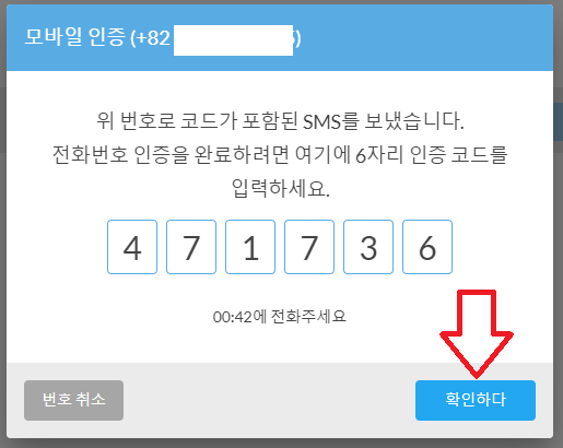 모바일 인증번호가 자신의 휴대폰으로 전송되게 되는데 확인 버튼을 눌러서 확인한다.