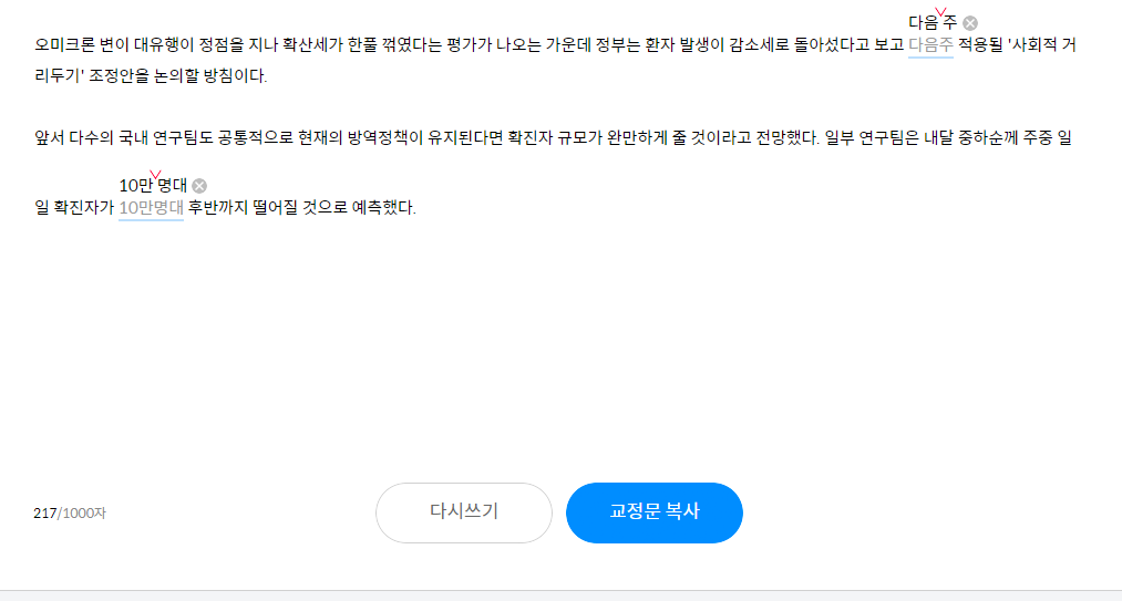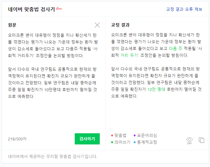 띄어쓰기가 잘못된 부분에 대해서는 자동으로 교정 결과를 보여줬다. 총 틀린 부분에 대해서도 표시되고 있는것을 확인할 수 있었다.