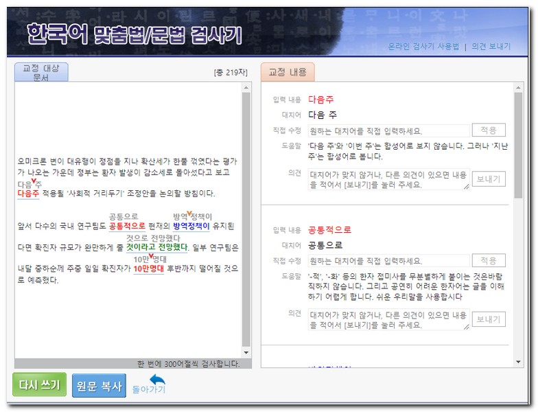 원문을 복사해서 다시 쓰기를 할 수 있으며 어떤 부분에서 맞춤법 문법이 틀렸는지 잘 표시해준다. 틀린 부분을 직접 수정에서 편리하게 교정할 수 있는게 가장 큰 장점이다.