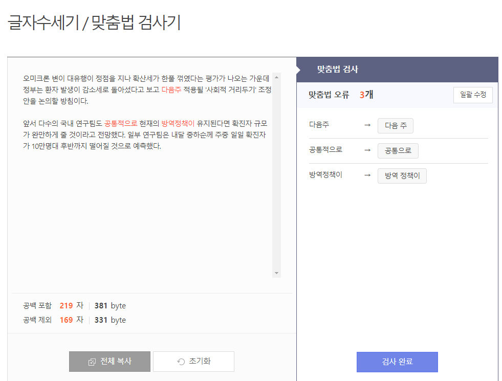 사람인 맞춤법 검사기는 맞춤법 오류나 틀린 부분에 대해서 총 개수를 표시해줬으며, 일괄 수정도 가능했다.