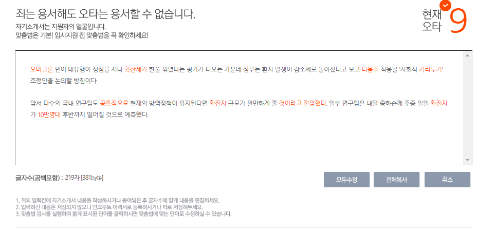 이력서, 자기소개서 작성시 오타 방지를 위해서 한국어 맞춤법 문법 검사기는 필수라고 말할 수 있다. 오타 뿐만 아니라 비슷한 어법이나 단어를 사용하고 있는 한글의 경우 꼭 맞춤법 문법 검사를 할 필요가 있다.