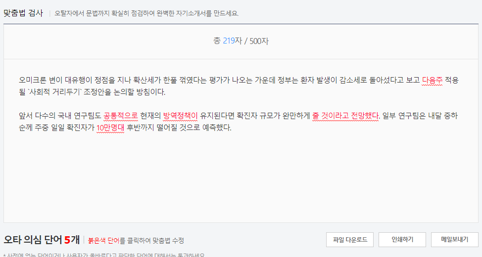 맞춤법이 틀린 부분에 대해서 개수가 표시되며 정확도는 다소 떨어지는것을 확인하였다.