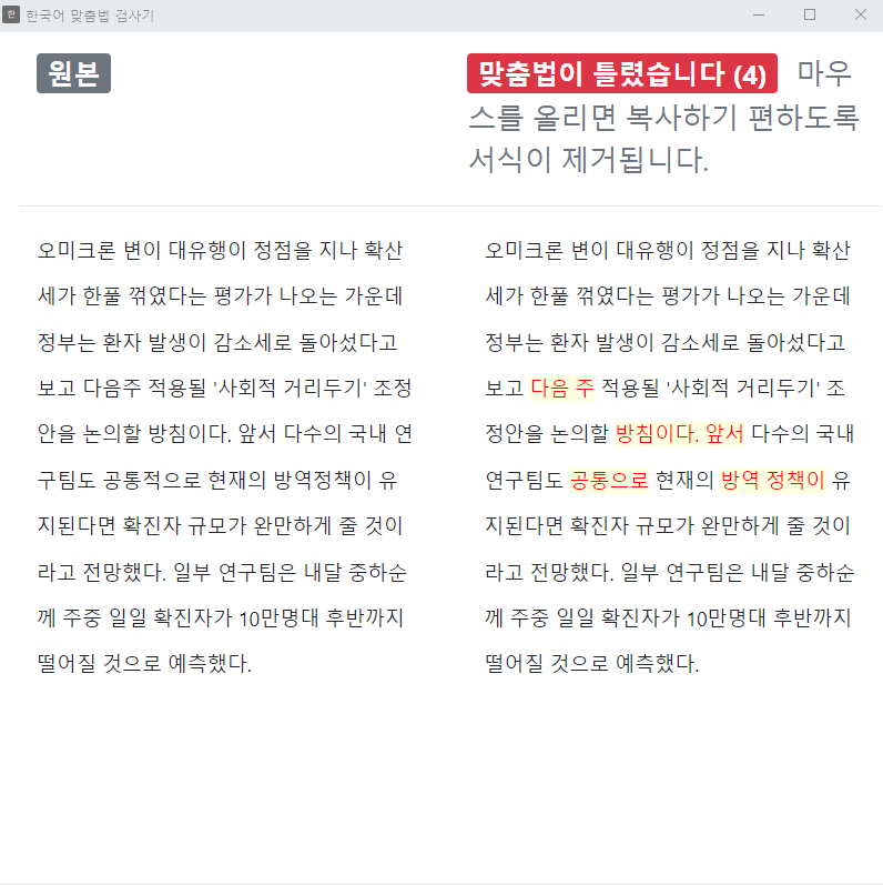현재 오타 개수에 대한 표시와 모두 수정할 수 있는 기능은 있긴 하지만 다소 검사 정확도가 떨어지는것을 확인하였다.