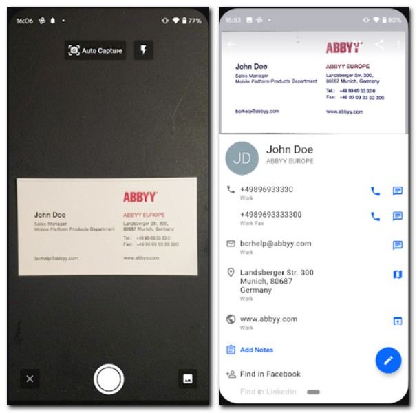 스마트폰이나 태블릿PC에 종이 명함을 스캔해서 보낼 수 있는 명함인식 관리 어플이다. 동기화 기능이 있어서 명함 정보를 클라우드서버에 저장해서 관리할 수 도 있다.