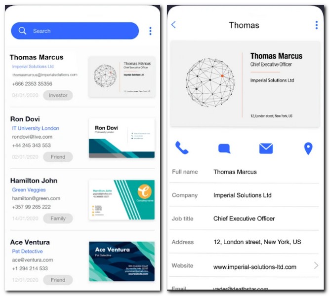 명함인식 리더 앱의 특징은 종이 명함 스캔으로 자동 등록이 가능하다. 앱을 실행하고 카드를 스캔하면 휴대폰 연락처에 자동으로 저장되기도 한다.