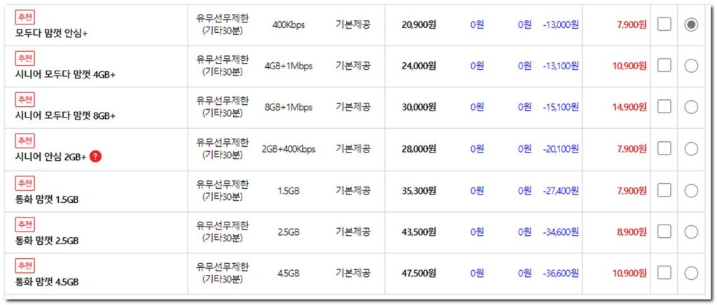이 밖에도 더 저렴한 요금제가 있긴 하지만 효율적이지 못한 부분이 있기 때문에 KT엠모바일에서는 시니어 모두다 맘껏 4GB+ 요금제가 저렴하고 실용적이다.