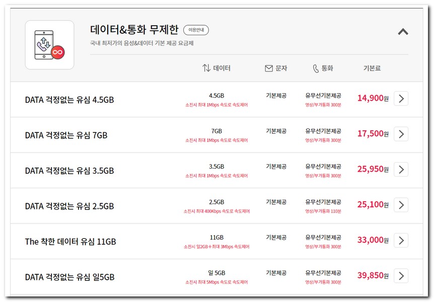 LG유플러스망을 사용할 경우 4.5GB+1Mbps 데이터 속도제한, 문자, 통화(영상,기타 300분) 제공의 DATA 걱정없는 유심 4.5GB는 14,900원이다.