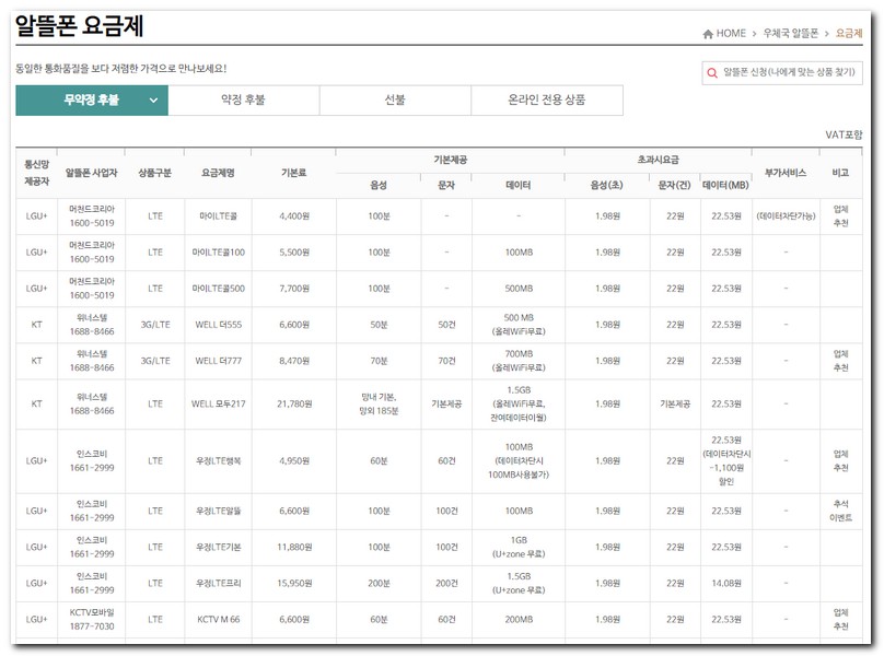 우체국에서도 알뜰폰 사업을 하는데, 여러통신사를 통해서 요금제를 제공하고 있다. 통화 문자 기본 제공, 데이터 1.5GB인 WELL모두217 요금제가 가장 괜찮다. 가격은 21,780원이다.