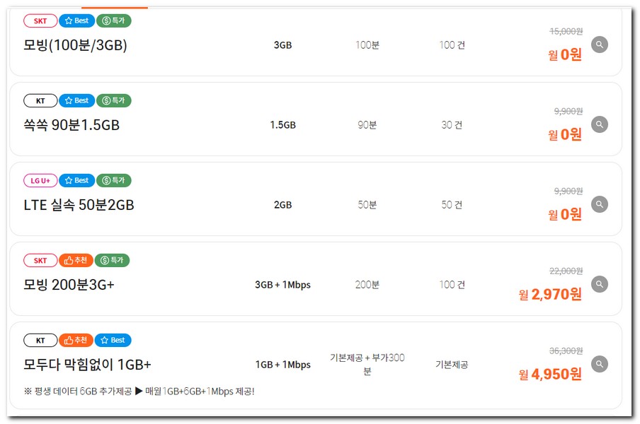 모빙이라는 알뜰폰 회사에서는 skt, kt, lg u+ 저렴한 요금제를 서비스 하고 있다. 무엇보다 월 0원인 요금제가 있는데, 이벤트 기간중이거나 카드 사용등 실적을 반영하면 월 0원으로 휴대폰 요금을 이용할 수 있다.