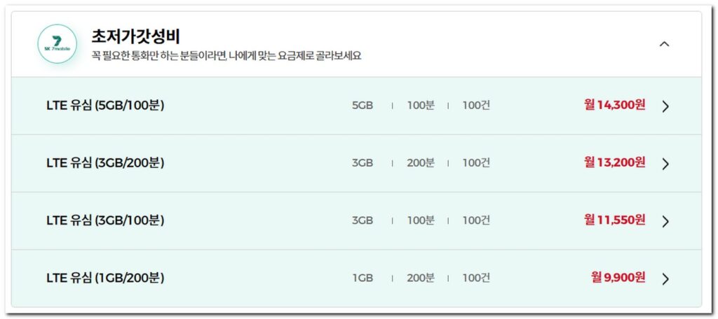 sk7모바일은 꼭 필요한 통화만 하는 사람들을 위해 나에게 맞는 요금제를 골라서 선택할 수 있다. 기본적으로 1만원 전후의 요금제를 선택할 수 있는게 특징이다.