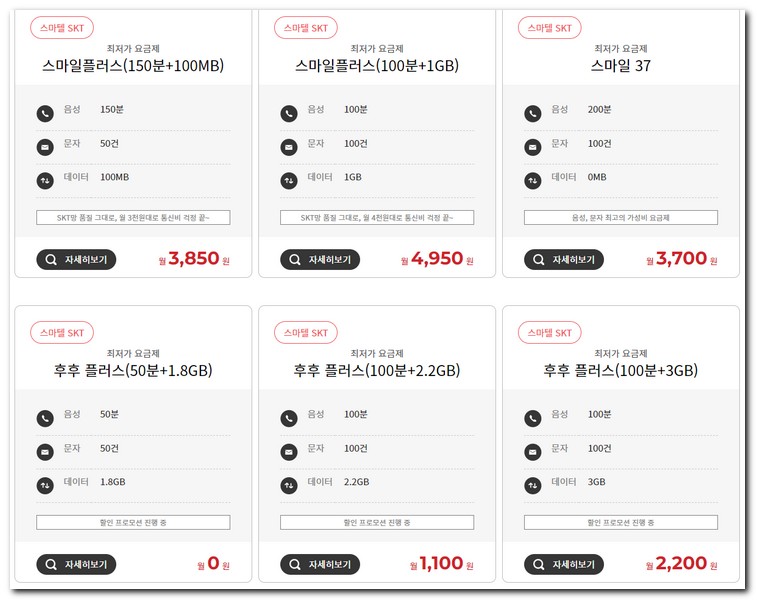 스마텔에서는 최저가 요금제를 제공하고 있는데, 음성 15분, 문자 50건, 데이터100MB가 사용하는 스마일플러스 요금제가 월 3,850원이다.