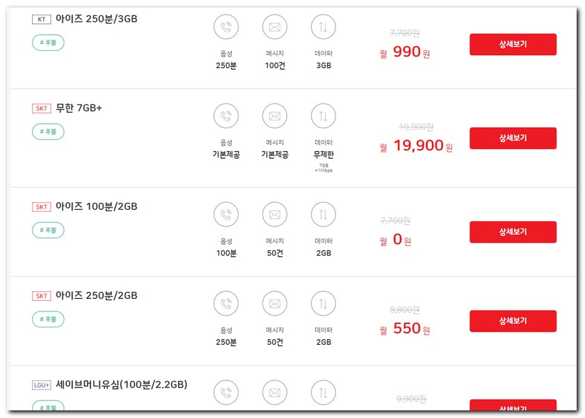 아이즈 모바일에서도 저렴한 요금제를 내놓고 있다. 할인행사 기간중에 혜택을 받을 수 있긴 하지만 음성 250분, 문자 100건, 데이터3GB 사용 요금제가 월 990원이다.