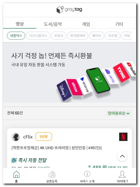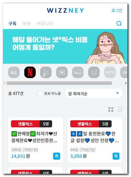 - 5인팟 구성으로 저렴하게 넷플릭스 시청이 가능(일 71원)