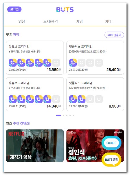 벗츠(buts)는 OTT 파티원 모집 사이트다. 회원가입을 해야 파티 만들기와 파티 접속이 가능하다.