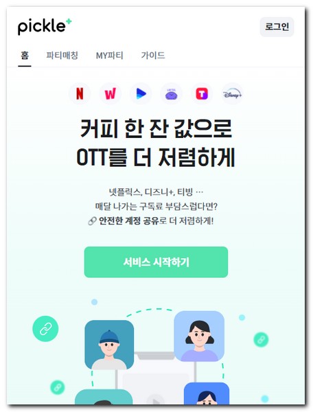 피클플러스 사이트는 OTT계정 공유 사이트다. 카카오계정으로 로그인해서 파티매칭이 가능하다.