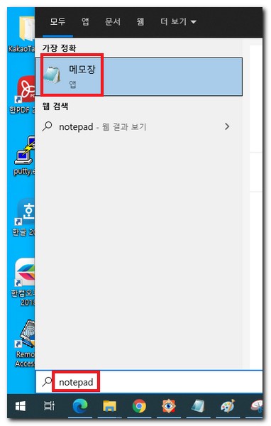 키보드에서 윈도우키 눌림 -> notepad 입력 -> 메모장 앱이 나타나면 클릭.
