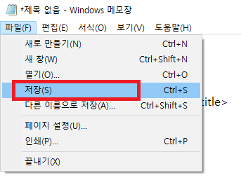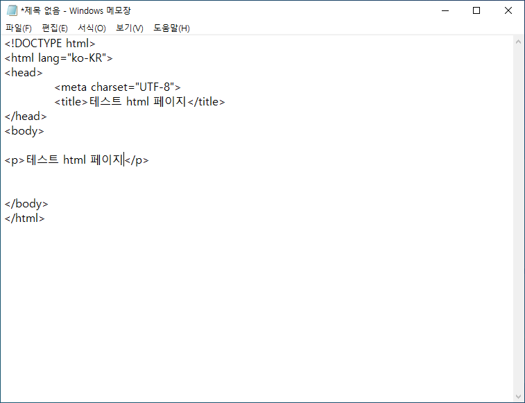 메모장이 생성되었다면 html 코드를 입력해준다. 가장 기본이 되는 코드이기 때문에 메모장에 그대로 작성하도록 한다.