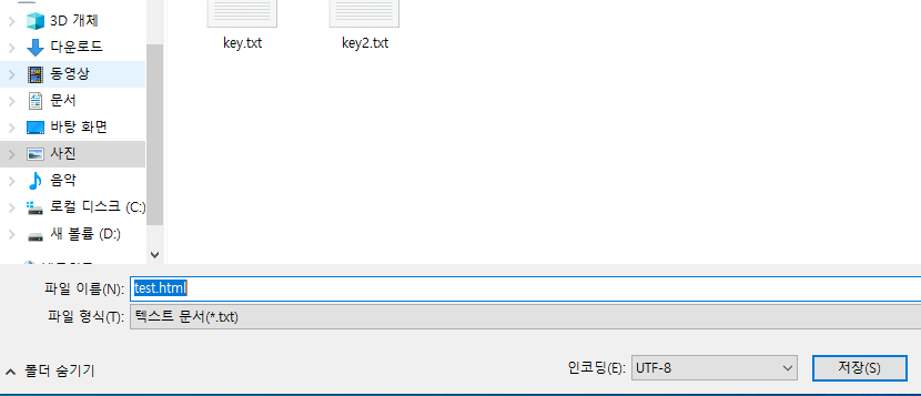 파일 이름은 .html 형태로 작성한다. index.html, test.html 형태로 작성되었다면 저장 버튼을 클릭한다.