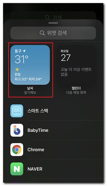 위젯을 검색할 수도 있고 직접 스크롤을 아래쪽으로 내려서 찾을 수도 있다. 아이폰 기본날씨앱인 일기예보 앱을 터치한다.