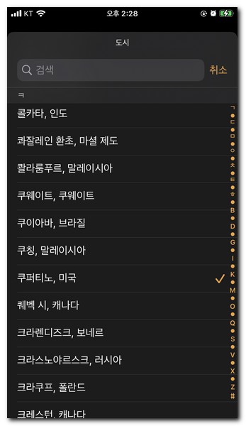 선택된 메뉴에서 편집하면 된다. 시계 앱의 경우 나라별 현지시간을 확인할 수 있도록 편집해서 추가할 수 있다.