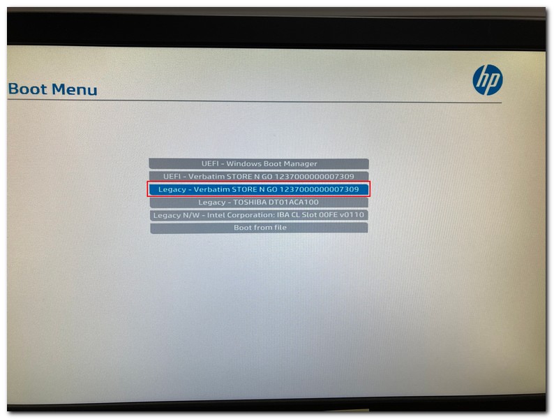 HP 컴퓨터의 경우 Boot Menu에 진입하게 되면 화면에 usb 저장장치의 모델명이 보인다. 엔터키를 눌려준다.