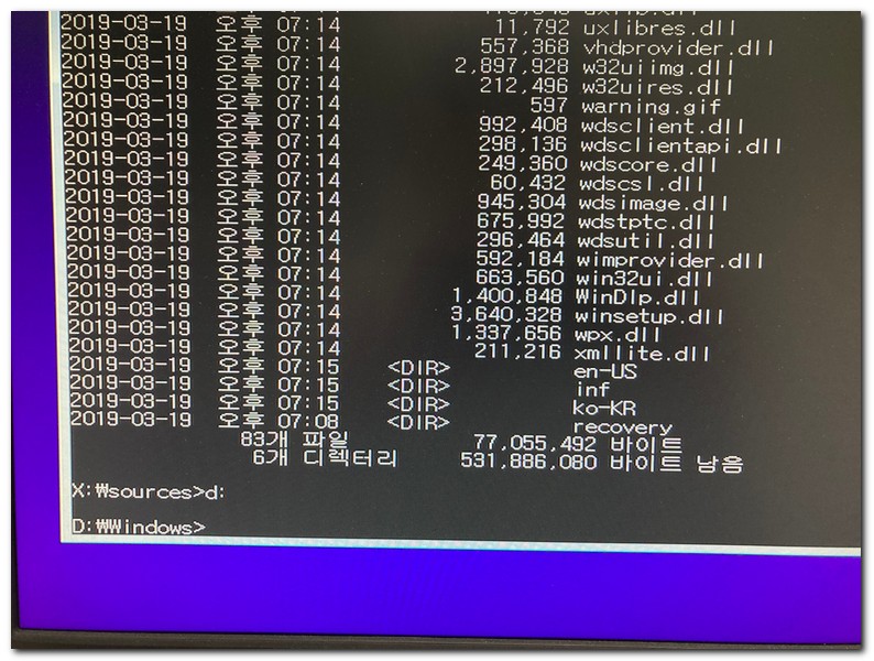 윈도우가 설치된 파티션으로 이동해야되는데, 일반적으로 D드라이브에 설치되어 있다.(윈도우 설치 화면에서는 d드라이브가 윈도우가 설치된 것으로 보인다.)