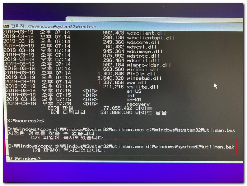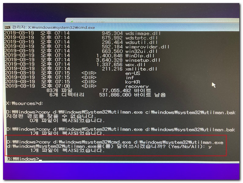 cmd.exe 파일을 utilman.exe로 복사한다.
