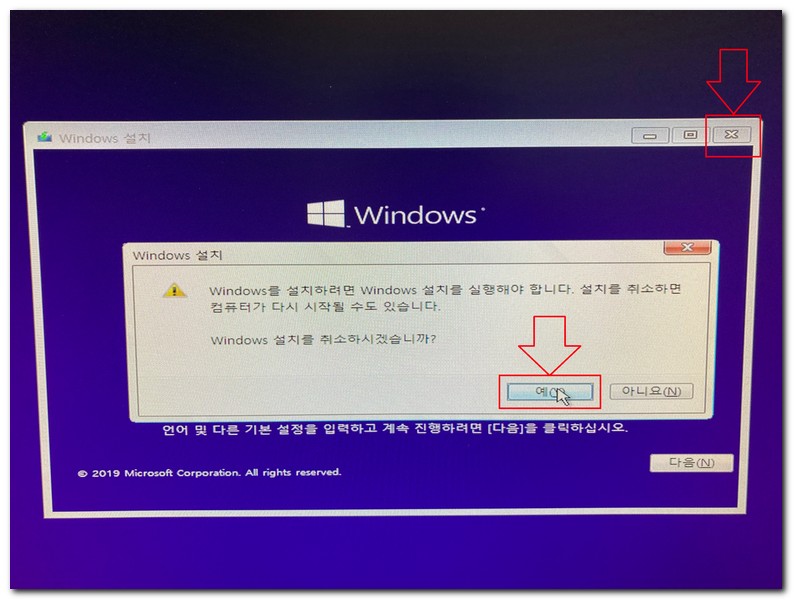 다시 윈도우 설치 화면으로 이동하게 되면 우측 상단에 x 표시를 클릭하고, 윈도우 설치를 취소한다. 이때 usb 저장장치를 컴퓨터에서 빼도록 한다.