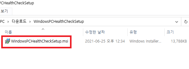 zip 확장자로 된 파일을 압축해제 하게 되면 WindowsPCHealthCheckSetup.msi 설치실행파일이 1개 생긴다. 더블클릭해서 실행한다.