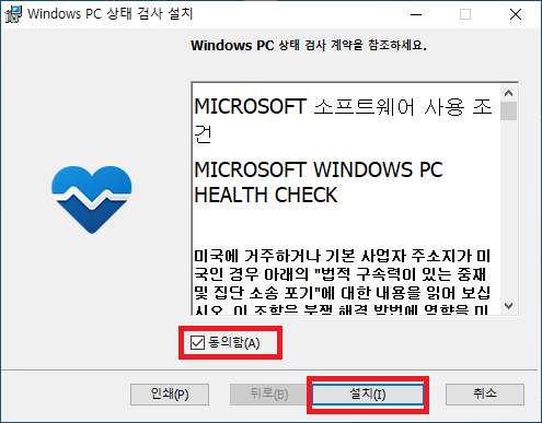 windows PC 상태 검사 프로그램이 실행되며, 동의함 버튼을 클릭해서 설치를 진행한다.