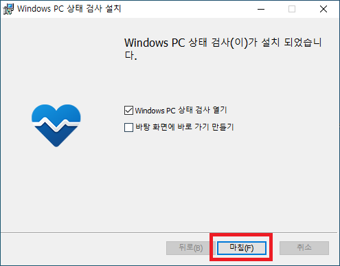 설치가 완료되면 윈도우 pc 상태 검사 열기를 체크표시 후 마침 버튼을 클릭한다.