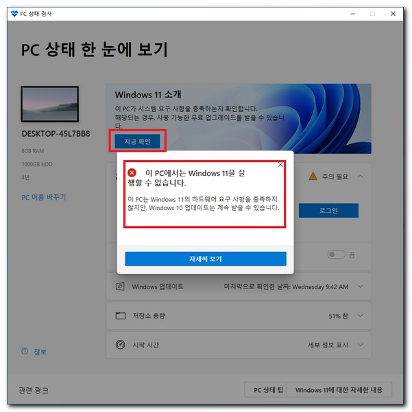 pc 상태 검사 프로그램을 실행한 모습이다. 내 컴퓨터의 pc 상태 한 눈에 보기가 가능하다. 화면에 윈도우11 소개가 보이는데, 지금 확인 버튼을 클릭해서 윈도우10이 윈도우11로 업데이트가 가능한지 확인한다.