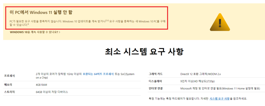 자세한 내용을 확인해보니 이 PC에서 윈도우11 실행 안 함으로 표시되는걸 다시 한 번 확인하였다.