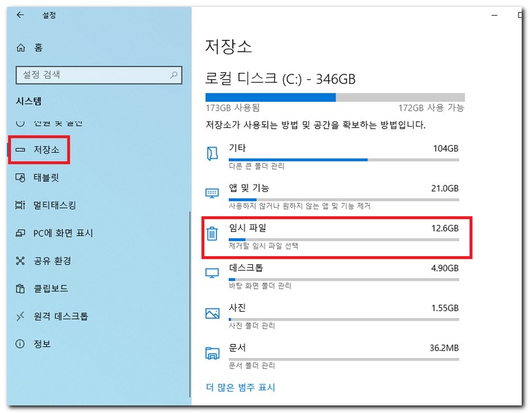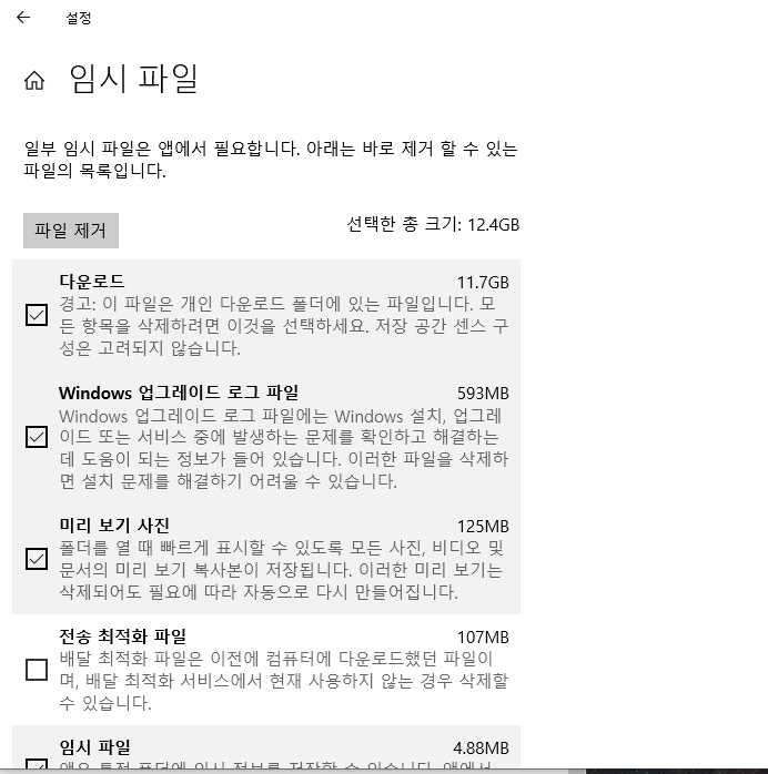저장소를 선택하게 되면 임시파일이 보인다. 제거할 임시파일을 선택해서 삭제할 수 있다. 무려 12.6GB정도가 임시파일로 저장되어 있다.