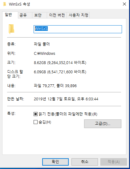 실제 얼마나 용량이 줄어들었는지 확인해보면 대략 1GB 정도의 용량이 줄어들었다는것을 확인할 수 있다. WinSxS 삭제하지 않아도 Dism.exe 명령어를 이용해서 충분히 디스크 여유공간을 확보할 수 있다.