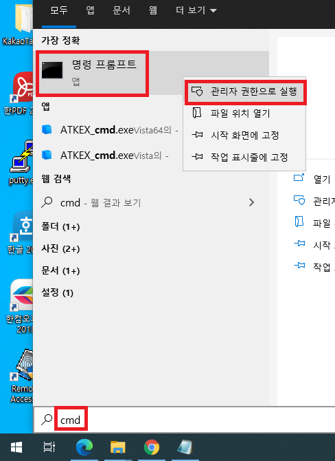 윈도우 시작 버튼 -> cmd 명령어 입력 -> 명령 프롬프트 나타나면 마우스 오른쪽 버튼 클릭 관리자 권한으로 실행.