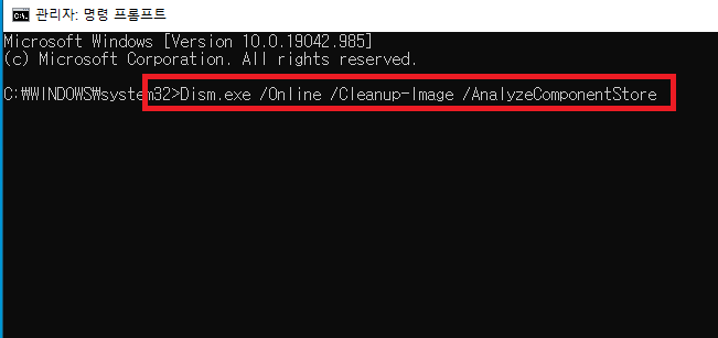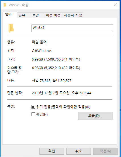 여기서 "구성 요소 저장소 정리 권장" 항목이 "아니오"라고 표시된다면 winsxs는 현재 최적화인 상태다. 만약 "예"라고 보인다면 winsxs정리가 필요한 상태라고 판단하면 된다.
