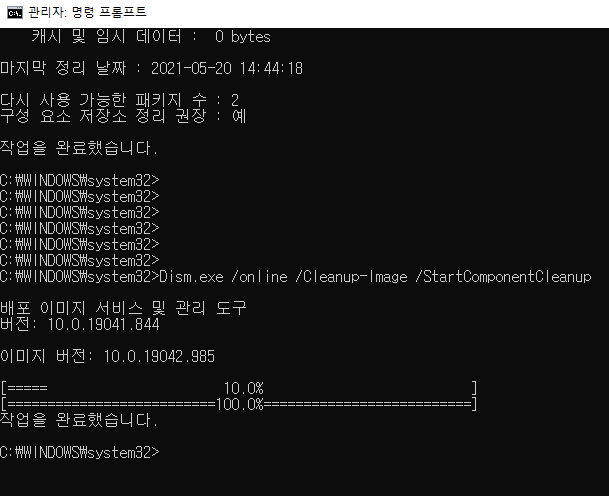 명령프롬프트에서 위 명령어를 입려하게 되면 시간이 생각보다 오래걸린다. 사용중인 컴퓨터의 PC성능에 따라서 1시간정도 소요되는 경우도 있다. SSD 디스크라면 조금 더 빨리 정리가 완료된다.