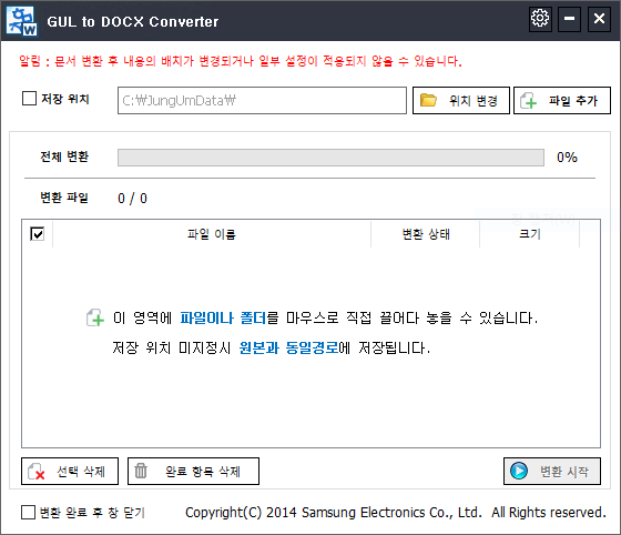 gul to docx converter 실행된 모습이다. 파일 추가 및 gul 파일이 저장된 위치를 지정할 수 있다. 변환시작 버튼을 클릭해서 gul 확장자로 된 모든 파일을 doc, docx 파일로 변환할 수 있게 된다.