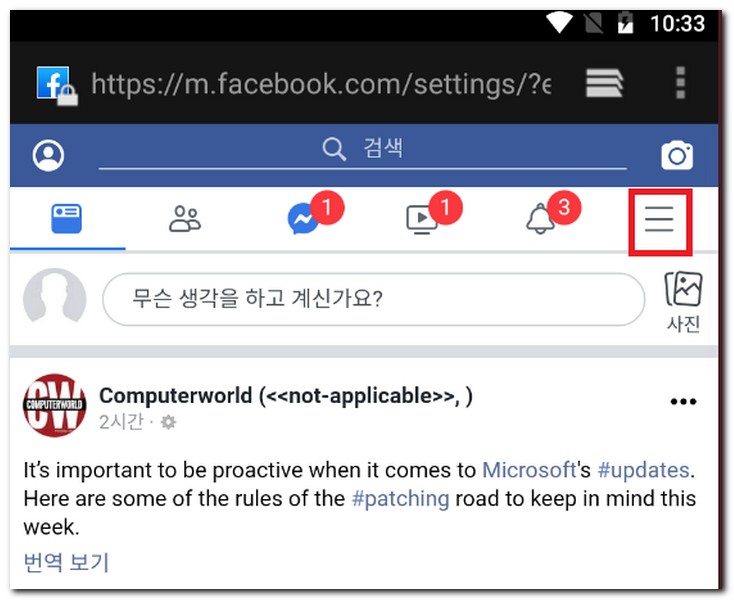 페이스북 게임연동 삭제는 페이스북 앱을 다운로드 받아서 설치후 삭제해도 되지만 모바일 인터넷 브라우저에서 바로 삭제할 수도 있다. 페이스북 로그인을 해서 우측 상단에 설정 메뉴를 터치한다.