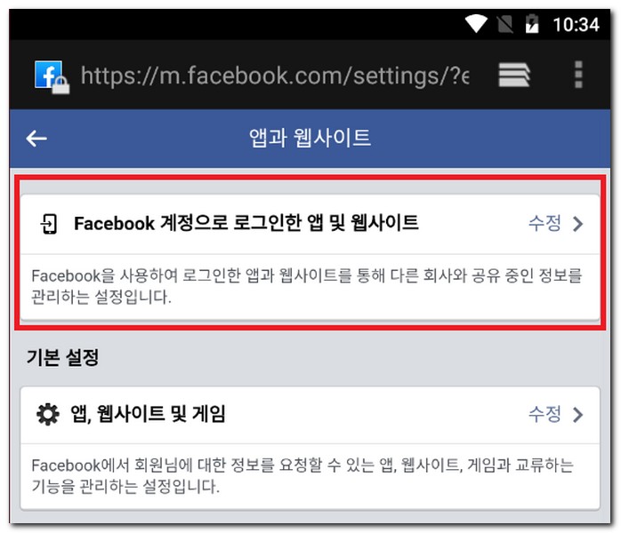 페이스북 계정으로 로그인한 앱 및 웹사이트를 터치한다. 페이스북을 사용해서 로그인한 앱이나 웹사이트, 게임연동된 부분을 삭제하거나 만료된 부분 등을 세부적인 설정을 할 수 있다.
