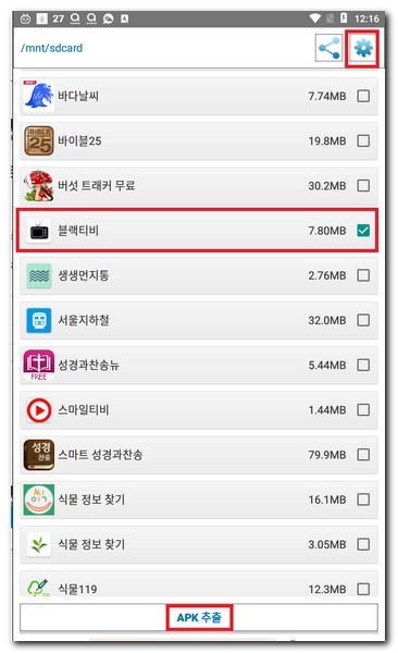 앱 추출 어플을 실행하게 되면 화면과 같이 현재 휴대폰에 설치된 어플리스트를 확인할 수 있다. apk파일로 만들고 싶은 앱을 체크박스 체크한다.