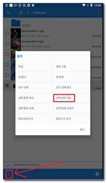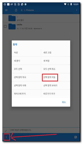 좌측 하단 점 3개 항목을 터치하게 되면 선택 항목 이동 버튼을 터치할 수 있게 된다.