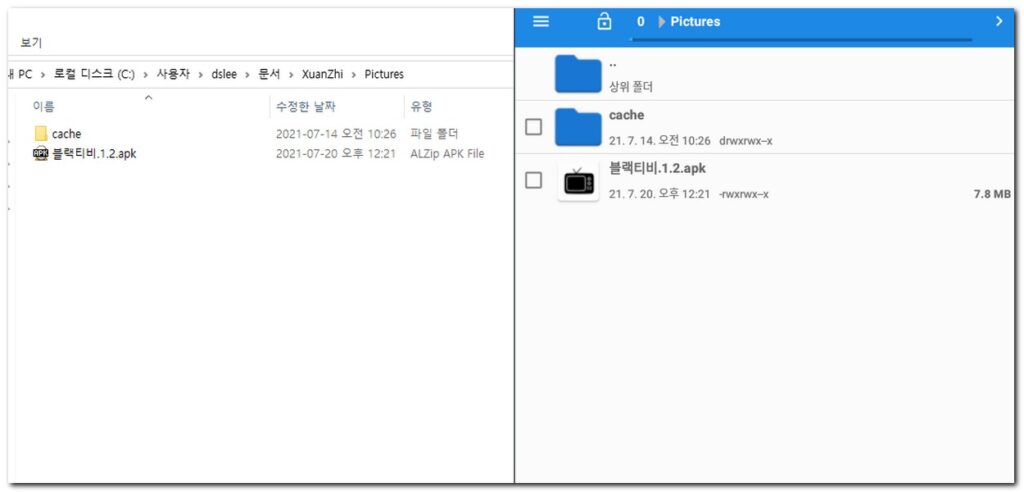 만들었던 apk파일이 추출된것을 확인하였고, PC로도 apk파일을 이동시킨것도 확인할 수 있다.