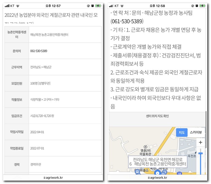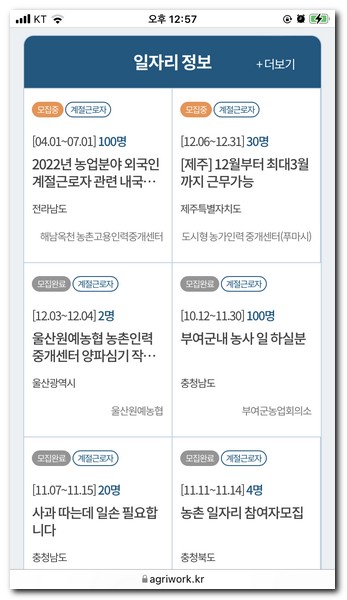 일자리 정보에서는 각 지역별로 중개센터에서 구인게시글이 올라오고 있으며 모집중인곳과 모집완료된 것으로 구분되어 있다. 대부분 계절근로자, 단기근로자로 구인을 하게 되는데 단기 아르바이트를 하고 싶을때 지원하면 된다.