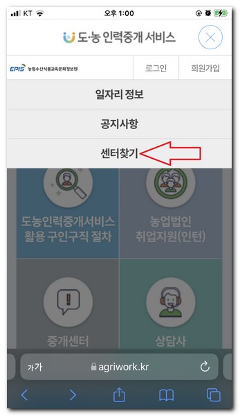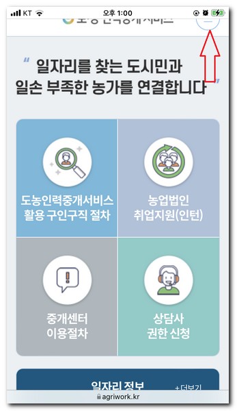 농촌 일자리 지원센터 위치를 찾고 싶다면 도농 인력중개 서비스 메인화면에서 우측 상단 메뉴를 터치한다.