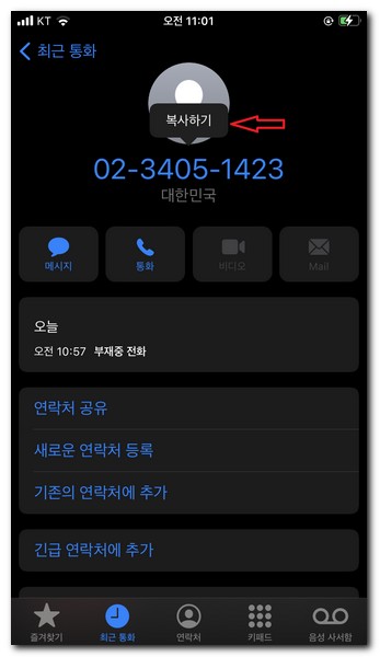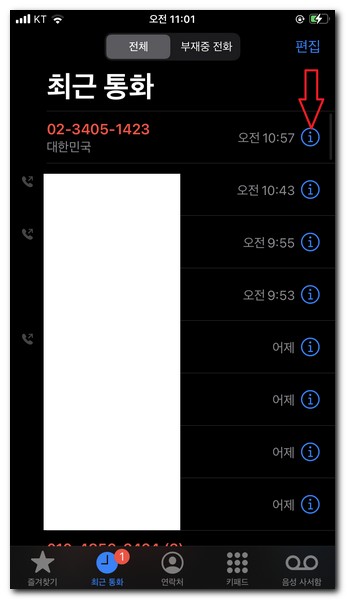 전화번호 확인을 위해서 아이폰의 경우 최근 통화목록에서 정보 화면으로 이동한다.