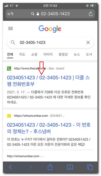 복사된 전화번호를 구글링을 위해서 구글 사이트로 접속한다. 그리고 붙여넣기 한다.