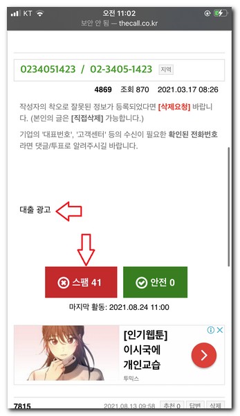 조금만 밑으로 내려가다보면 대출 광고, 스팸 41개나 표시되어 있는걸 확인할 수 있다. 마지막 활동시간도 2021.08.24 11:00로 되어 있다.